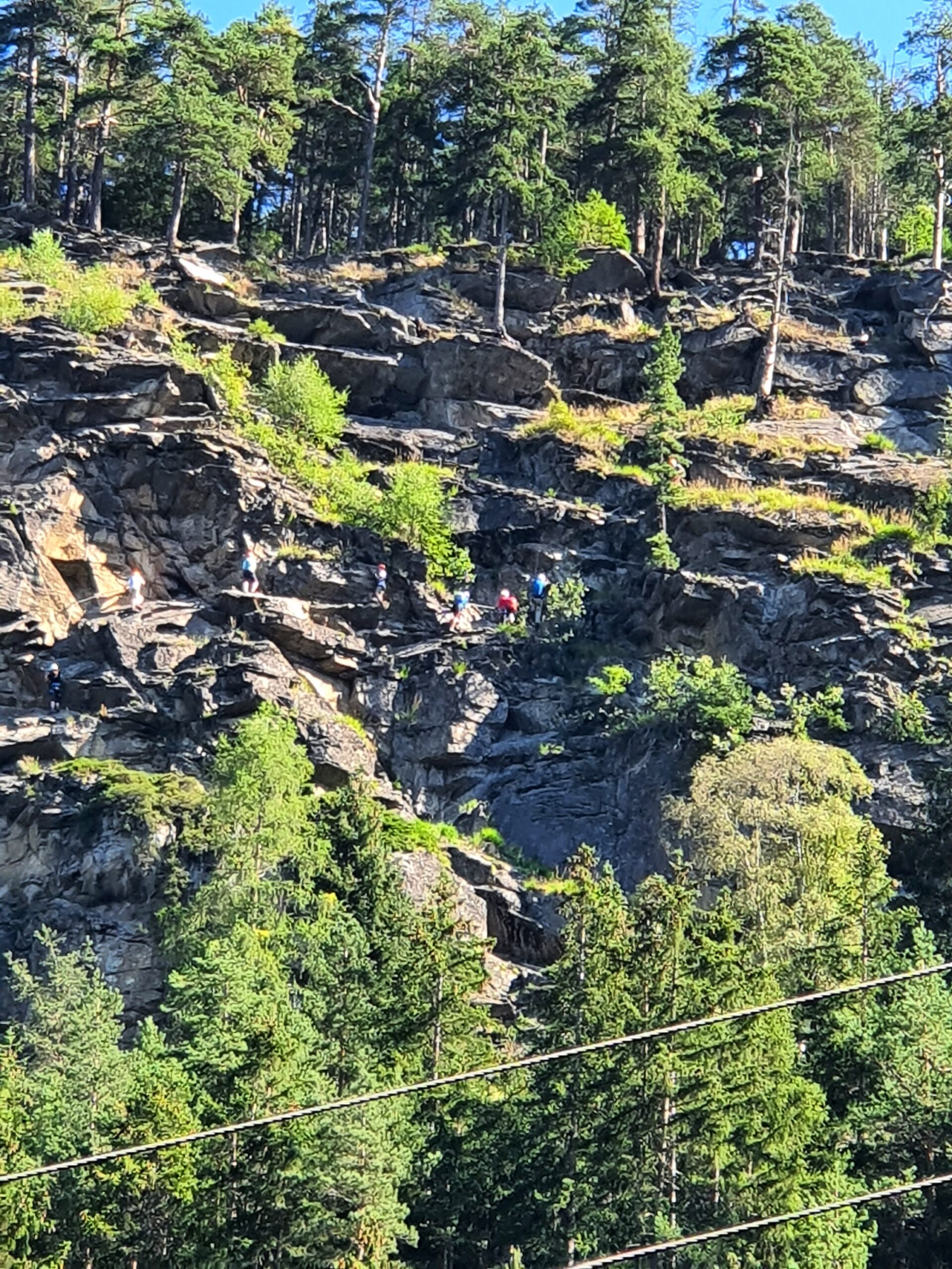 A via ferrata is a climbing route that employs steel cables, rungs or ladders, fixed to the rock to which the climbers affix a harness with two leashes, which allows the climbers to secure themselves to the metal fixture and limit any fall. The cable and other fixtures, such as iron rungs (stemples), pegs, carved steps, and ladders and bridges, provide both footings and handholds, as well. This allows climbing on otherwise dangerous routes without the risks of unprotected scrambling and climbing or the need for technical climbing equipment. They expand the opportunities for accessing difficult peaks as an alternative to rock climbing and mountaineering, both of which require higher skills and more specialized equipment. (Wikipedia)