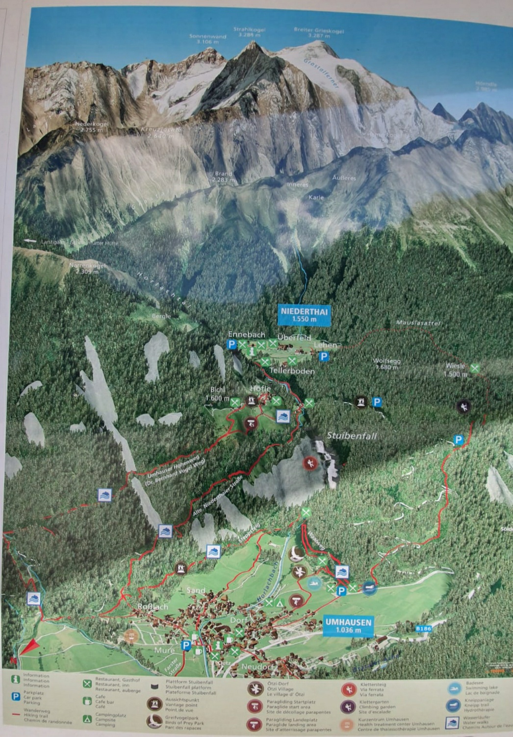 The Stuibenfall waterfall is accessible both from above and below. The Bischoffsplatz car park just off the main road to Umhausen is at the foot of the waterfall and leads to the waterfall in about 30 to 60 minutes.